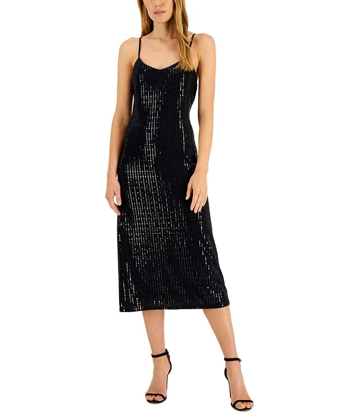 Anne Klein’s midi-length slipdress gets an added dose of shine thanks to heat-fixed sequins and metallic-flecked fabric.